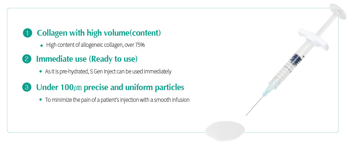 On the purpose of soft tissue reconstruction, S Gen Inject can be used for treatment or supplement on damaged tissue such as ligaments, tendon and muscles